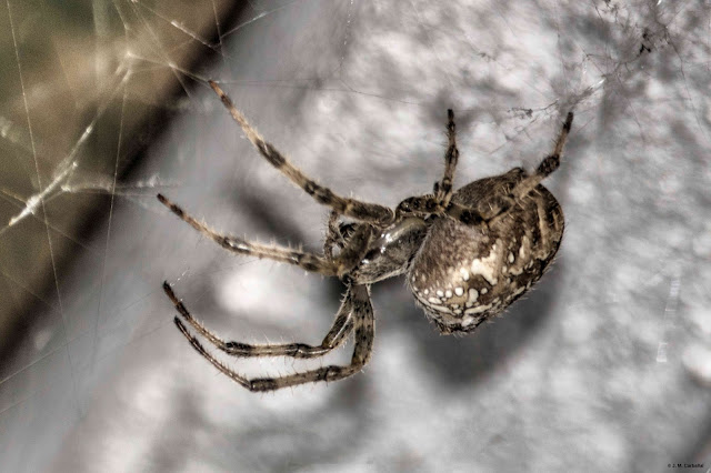 Pero la verdad es que esta Araneus didaematus esté en la ventana de la galería de mi casa, donde hay muchas mas arañas de otras especies y parece que en parte les ha copiado el comportamiento.